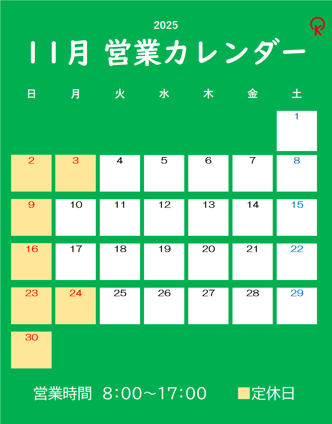 高陽建設工業株式会社 営業カレンダー 2025年11月